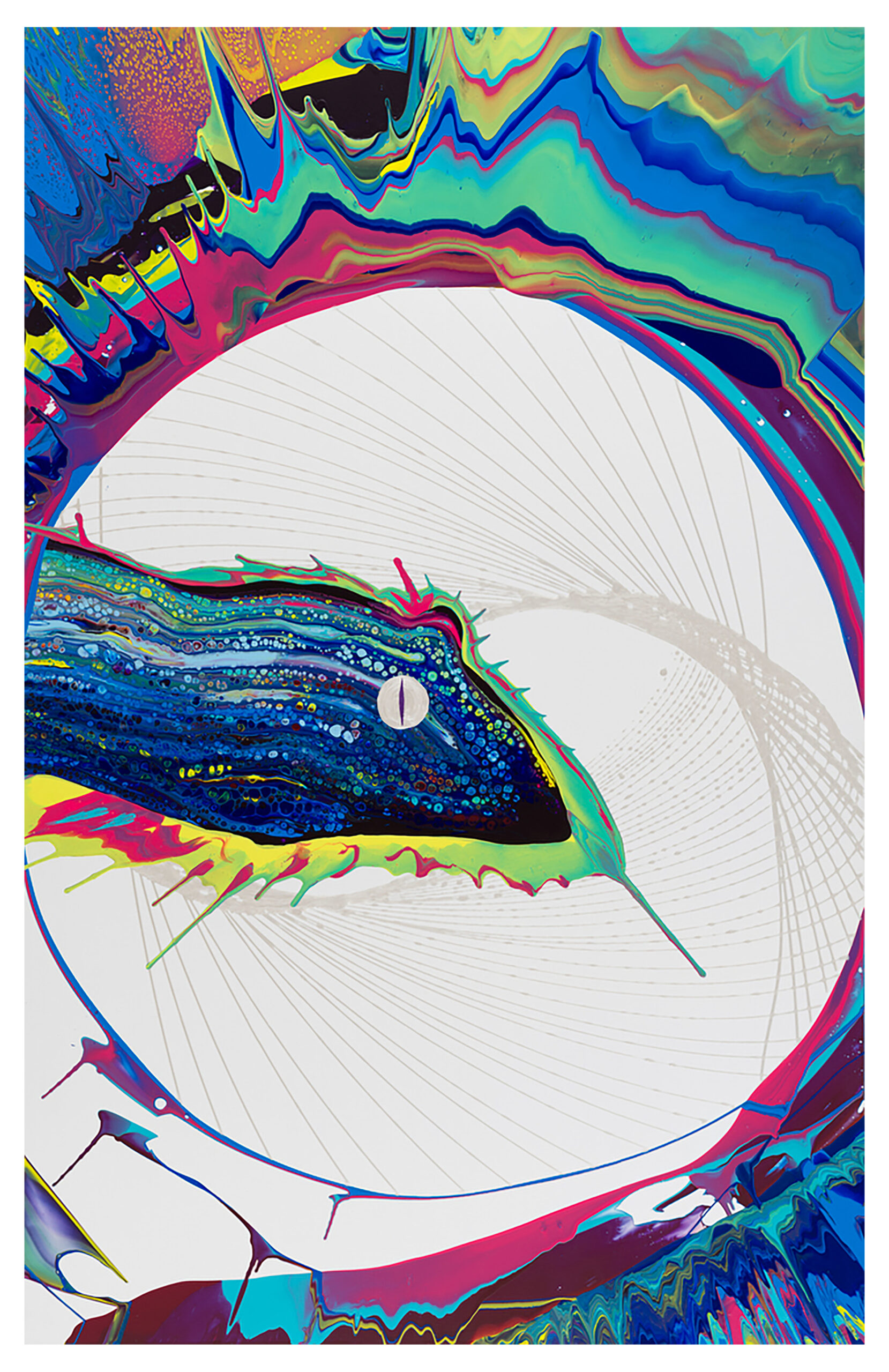 Twelfth painting in the Lemon Frost series. It continues the color line of the previous works. The tones of the painting are slightly darker. The work features a morph of Lemon Frost idealized with a pearl colored eye. The painting introduces the use of one more technique than the previous work, which emphasizes the artist’s continued experimentation.